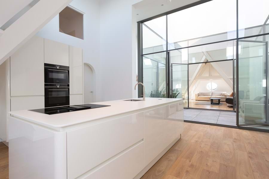 Layout: The entrance to the building leads through a marble floor vestibule into a grand central hall with an authentic monumental staircase. This magnificent penthouse is located on the top (4th) floor and can be reached by lift. The spacious sunny living/dining room (105 m2) consists of 3 adjacent areas surrounding a beautiful large (16m2) patio accessed by glass doors. It is in full light during the day and at night it offers a breathtaking view of the stars. The high ceilings, original beams and skylights contribute to making it a light and unique living area with a view of The Hague. The living/dining room also has two luxurious 4-seat sofas, a 49 inch 4K Smart TV and a black oak dining table (2 x 1 m) with 4 chairs. The spacious Next125 high gloss kitchen (28 m2) has a cooking island with a Corian worktop and brand new accessories. It is equipped with Siemens appliances – among others dishwasher, downdraft induction hob, Quooker, multifunctional oven and a separate microwave oven. Adjacent to it is a bedroom (14 m2).