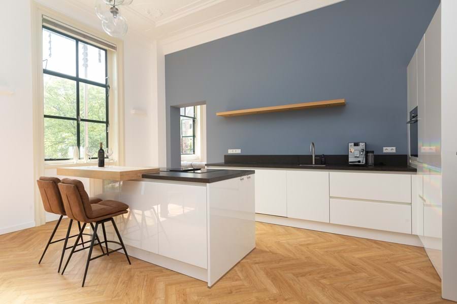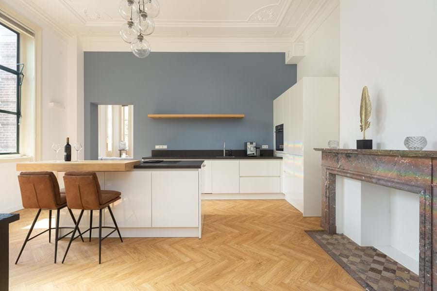 Indeling: Na binnenkomst in de prachtige centrale hal met marmeren vloer en wanden betreedt u de schitterende ontvangsthal met de authentieke monumentale houten trap. Op deze verdieping (1e) aan de rechterzijde treft u de ingang van dit bijzondere op het zuidoosten gelegen appartement. De ruime lichte woonkamer (35 m2) van dit prachtige appartement is voorzien van een 49 inch 4K Smart TV en loopt over in de woonkeuken en is voorzien is voorzien van prachtige plafondornamenten, 2 authentieke grote schouwen en een visgraat vloer. De hoge plafonds (3,90 m) en de grote raampartijen maken het tot een unieke ruimte. De woonkeuken (34 m2) is voorzien van een luxe keuken met kookeiland en bar. De Next125 hoogglans keuken beschikt over Siemens inbouwapparatuur waaronder een vaatwasser, downdraft inductiekookplaat, Quooker en multifunctionele oven met magnetron. De openslaande deuren bieden toegang tot het balkon met glazen balustrade (4,50 x 1,40 m) gelegen op het zuidoosten.